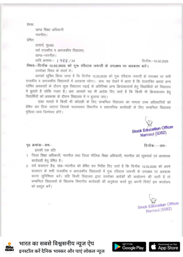 प्रदेश में कई बार देखा गया है कि सरकारी राजपत्रित अवकाश के दिन भी कई निजी स्कूल खुले रहते हैं. विशेष रूप से महेंद्रगढ़ जिले के स्कूलों में इस तरह की लापरवाही अधिक देखी जाती है. शिक्षा विभाग को बार-बार नोटिस जारी करना पड़ता है ताकि स्कूल संचालक सरकारी आदेशों का पालन करें. इस बार भी रविदास जयंती के मौके पर सरकारी छुट्टी घोषित की गई है, जिसे लागू करने के लिए विभाग ने औपचारिक पत्र जारी किया है.
